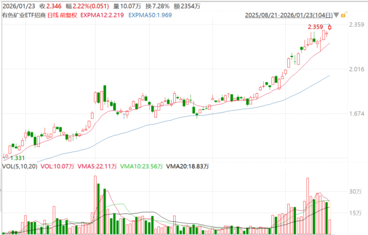 1月23日,贵金属延续大涨,白银有色四连板,湖南白银涨超8%,驰宏锌锗、赤峰黄金、兴业银锡、中金岭南、西部黄金等涨超5%。有色矿业ETF招商(159690)涨2.22%,盘中继续刷新上市以来新高,该ETF连续9日获资金净流入1.43亿元。